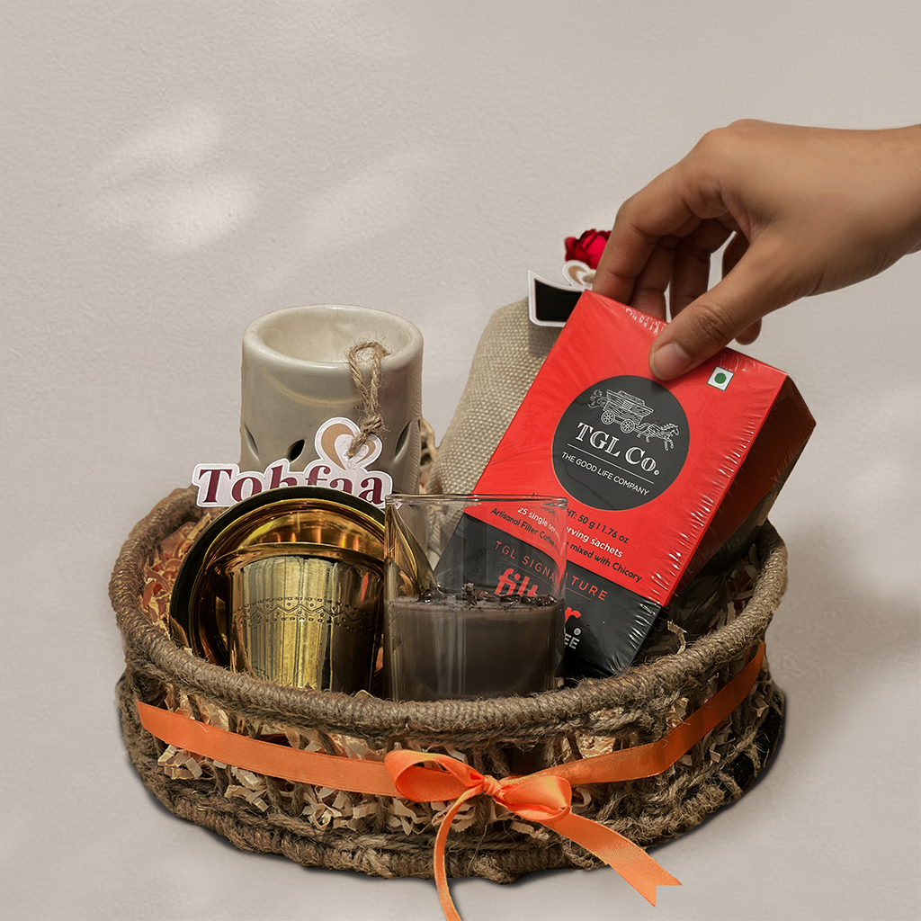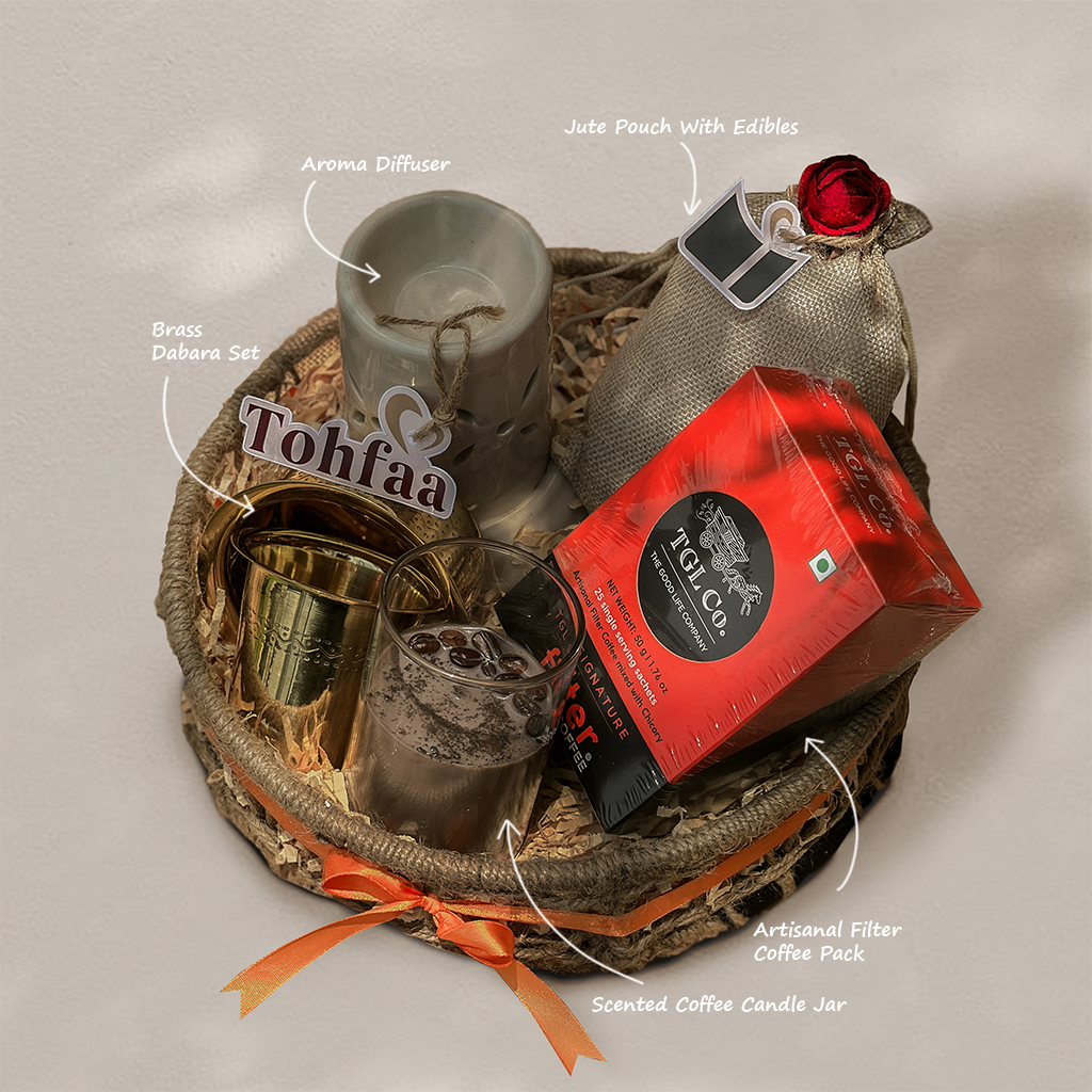 Curated in a bold round jute tray (brown & black), the hamper is a sensory journey into South India’s coffee traditions with a modern twist.